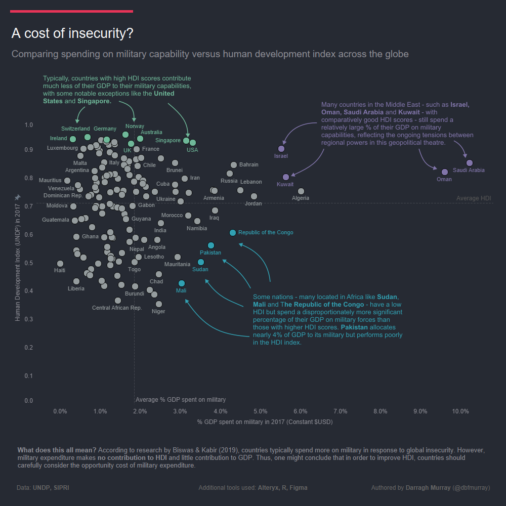 Some interesting insights are pretty apparent looking at these datasets. There is a host of nations who rate low on the HDI but who spend relatively big on military capability (typically in Africa, but Pakistan is also in the mix).