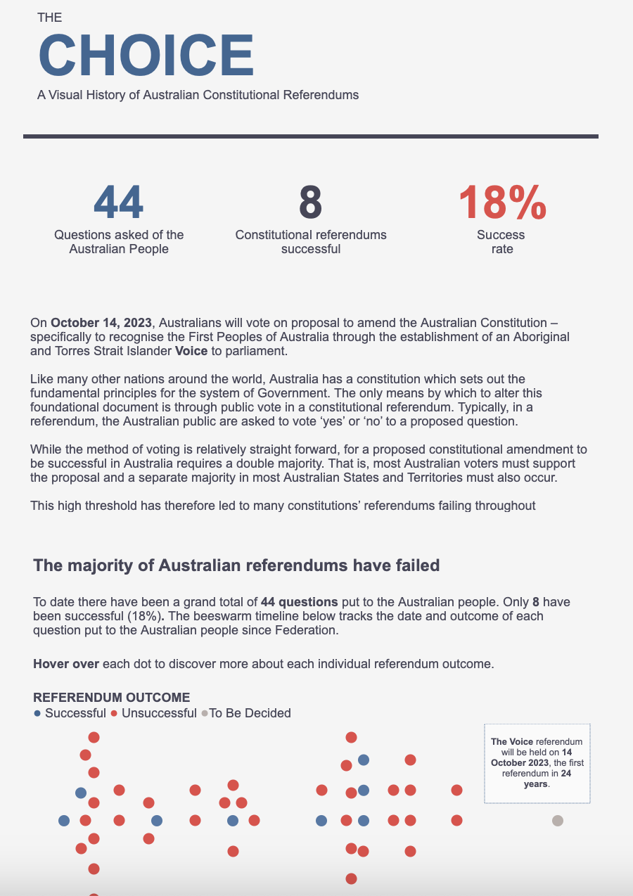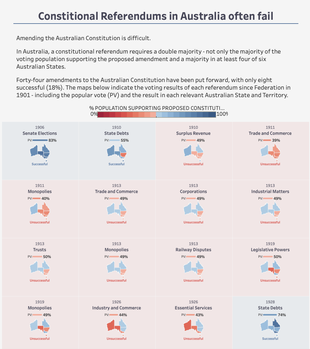 Early last month, I published a series of new Tableau Public visualisations on the history of referendums in Australia, immediately prior to the latest Australian referendum vote on recognising Indigenous Australians in our constitution - commonly known as the referendum on The Voice to parliament (the vote failed but I’m not going to delve into the politics of that outcome here).